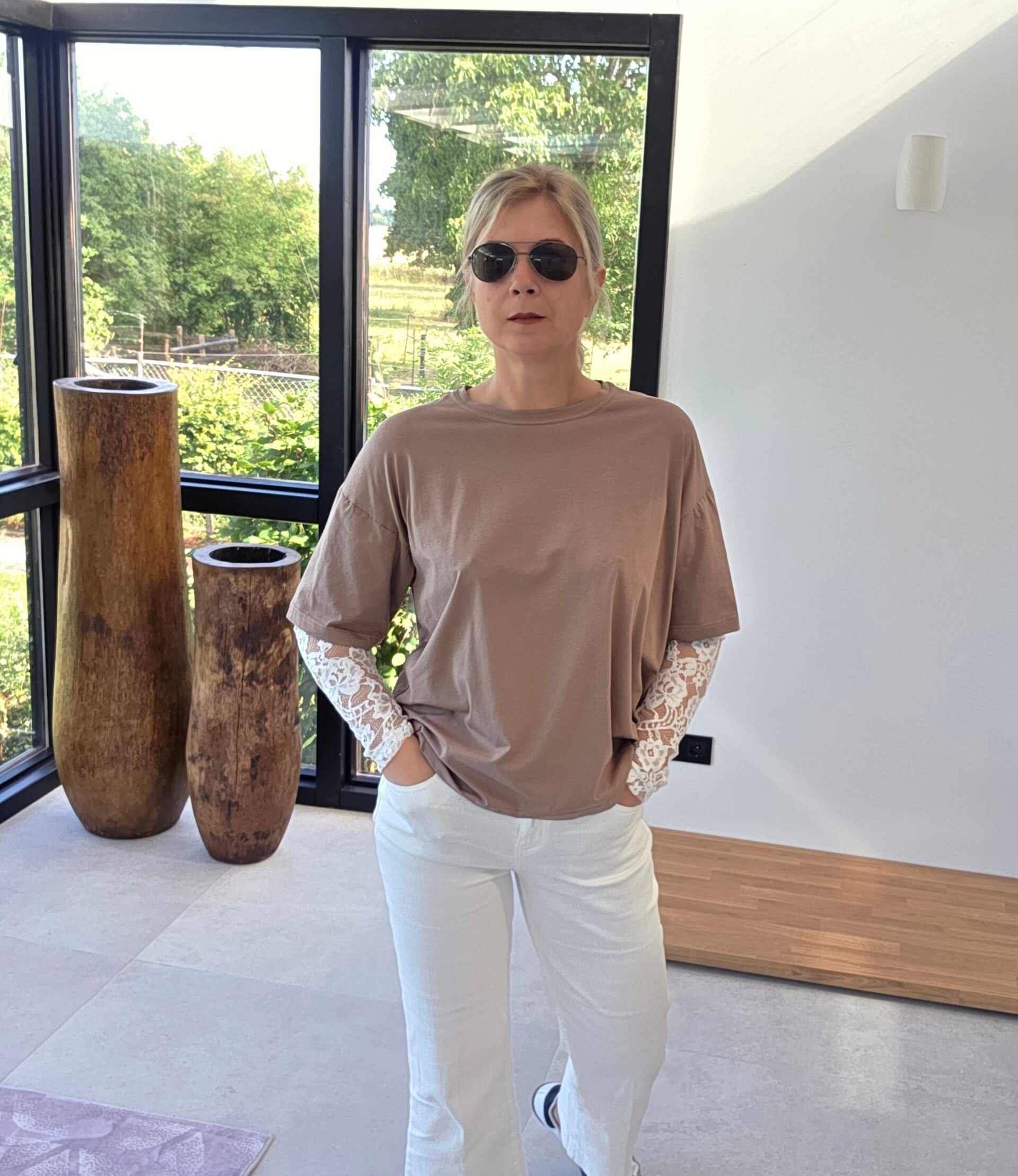 Das Shirt ist in Beige und Cappuccino erhältlich und eignet sich perfekt für modebewusste Frauen, die Casual-Looks mit einem Hauch Eleganz kombinieren möchten. Ideal zu Jeans, Stoffhosen oder Röcken – ein vielseitiges Must-have für Alltag und Freizeit.