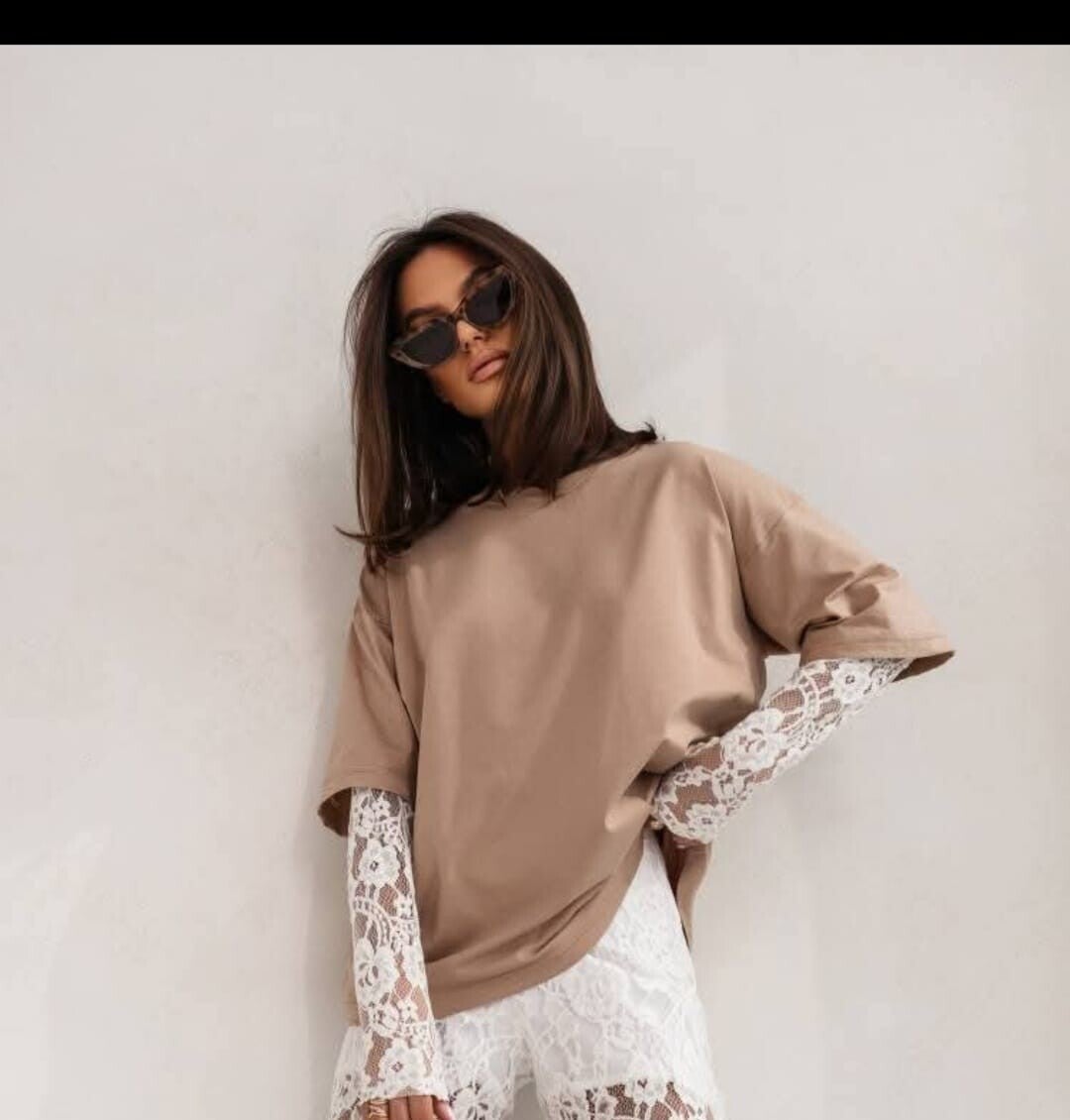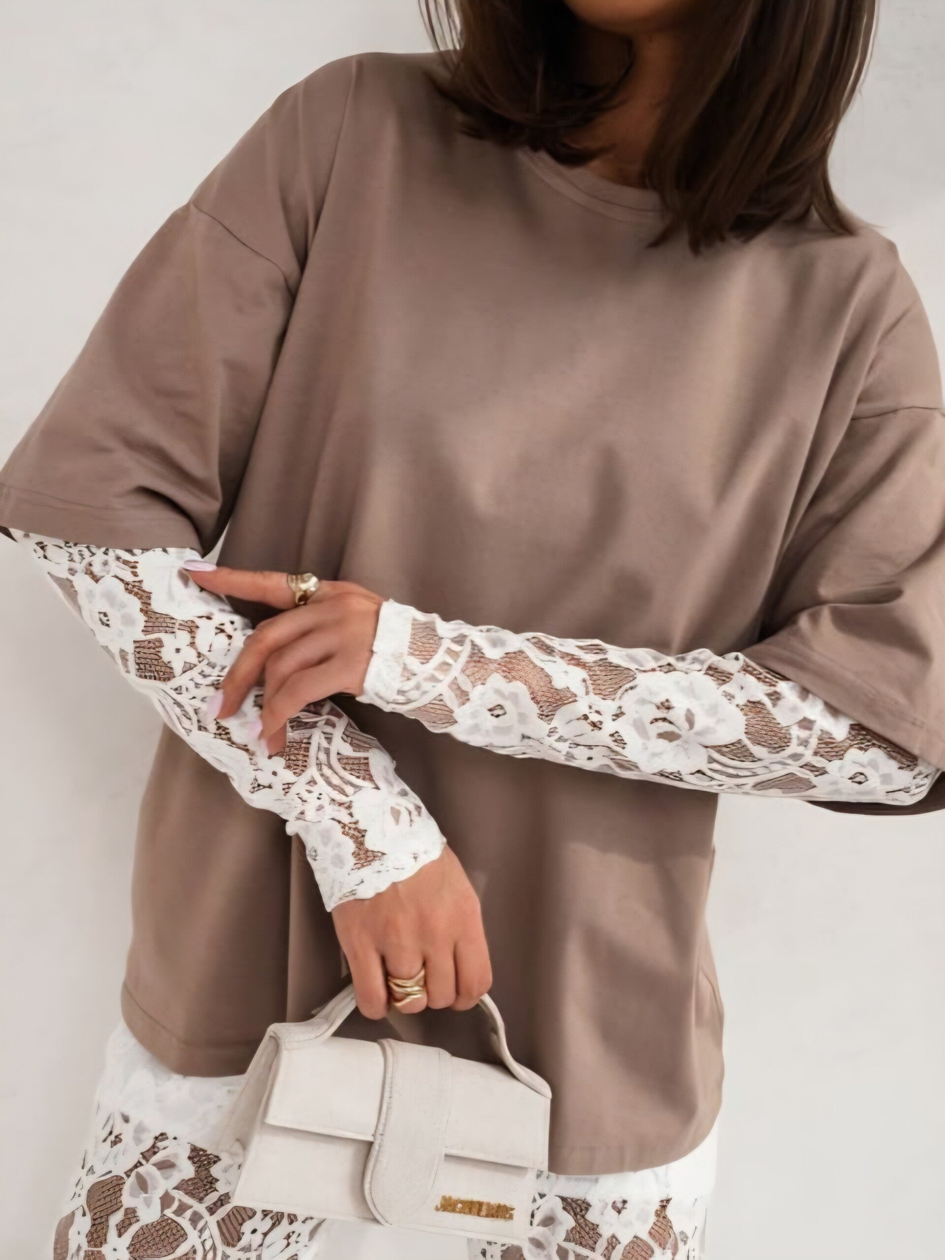 Dieses besondere Langarmshirt verbindet lässigen Oversize-Style mit femininen Details. Highlight sind die transparenten Spitzenärmel in Weiß, die dem Shirt einen eleganten Akzent verleihen. Der Spitzeneinsatz ist nicht elastisch und eignet sich daher vor allem für schlanke Arme.