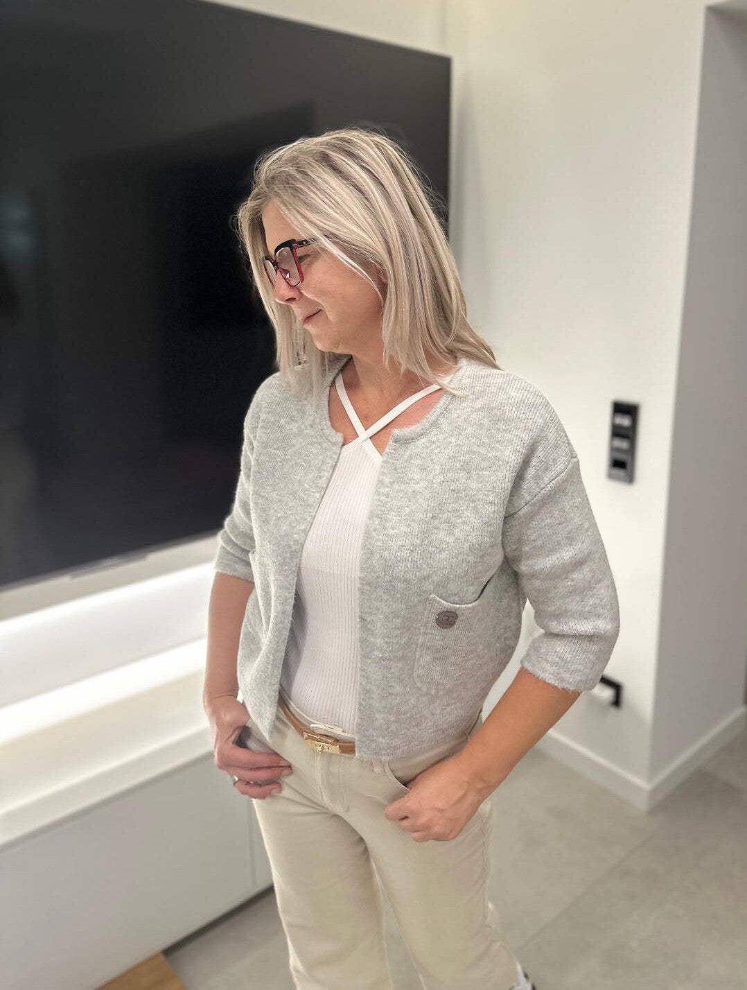 Diese stilvolle Strickjacke ist die perfekte Wahl für lässige und elegante Outfits. Sie ist in den Farben Beige, Grau und Schwarz erhältlich. Der Gummizug hinten sorgt für eine schöne Passform und eine feminine Silhouette. Die 3/4-Ärmel machen sie ideal für jede Jahreszeit.