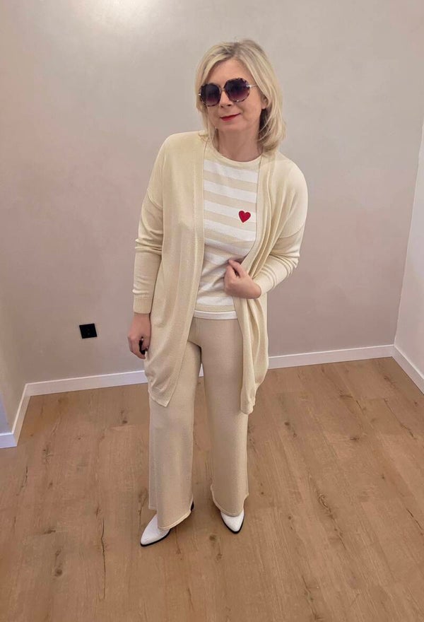 Dieses gestreifte Strickshirt bringt frischen Schwung in deine Garderobe. Das weiche Material aus Viskose-Mix sorgt für hohen Tragekomfort, während das kleine rote Herz auf der Brust einen charmanten Akzent setzt.