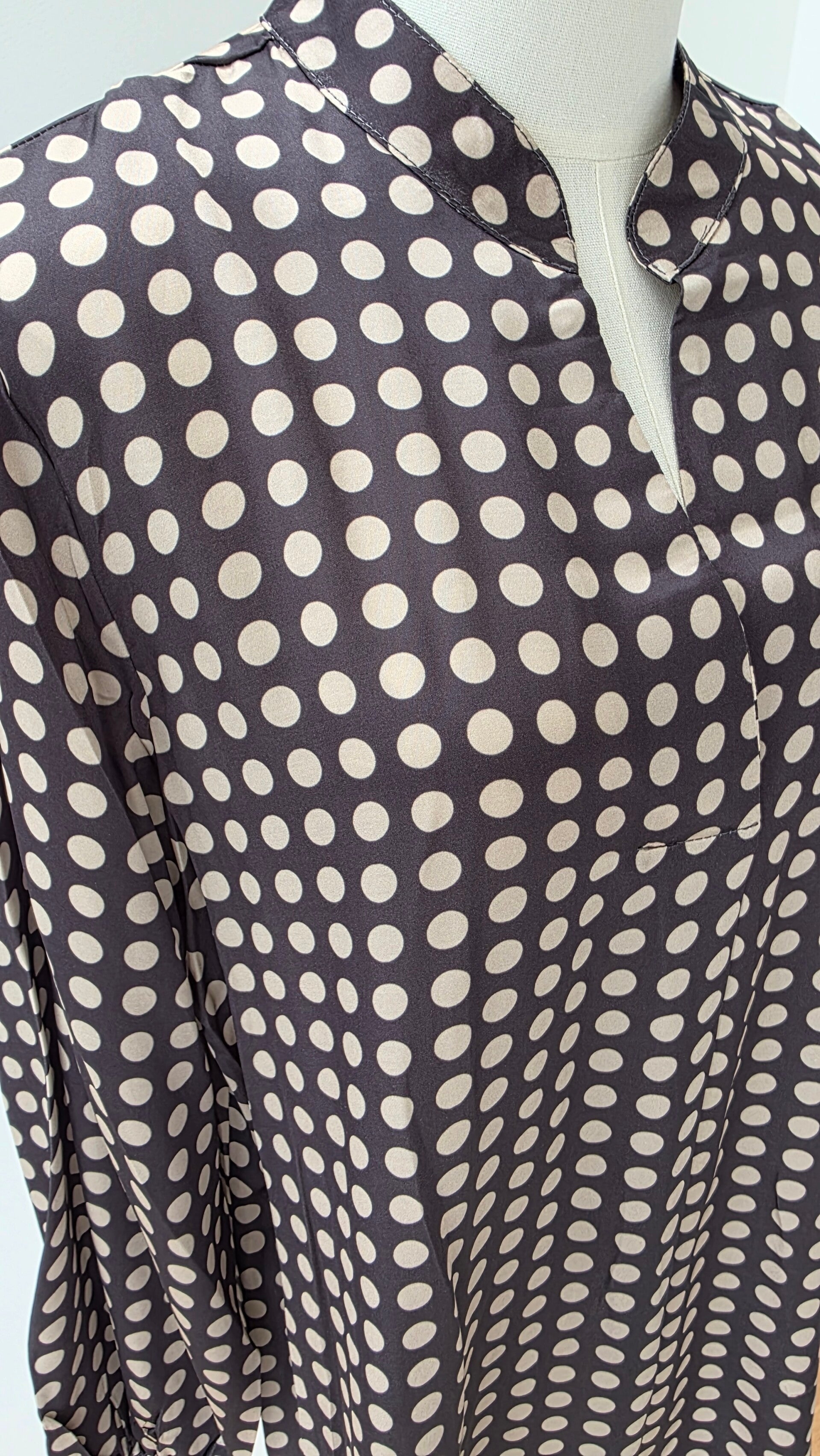 Das Modell hat einen lockeren, bequemen Schnitt mit V-Ausschnitt und kleinem Stehkragen. Besonderes Highlight ist das moderne Muster in Braun und Graphitgrau mit cremfarbenen Punkten . Die langen Ärmel sind mit einem elastischen Bund am Handgelenk versehen und verleihen der Bluse eine elegante Note.