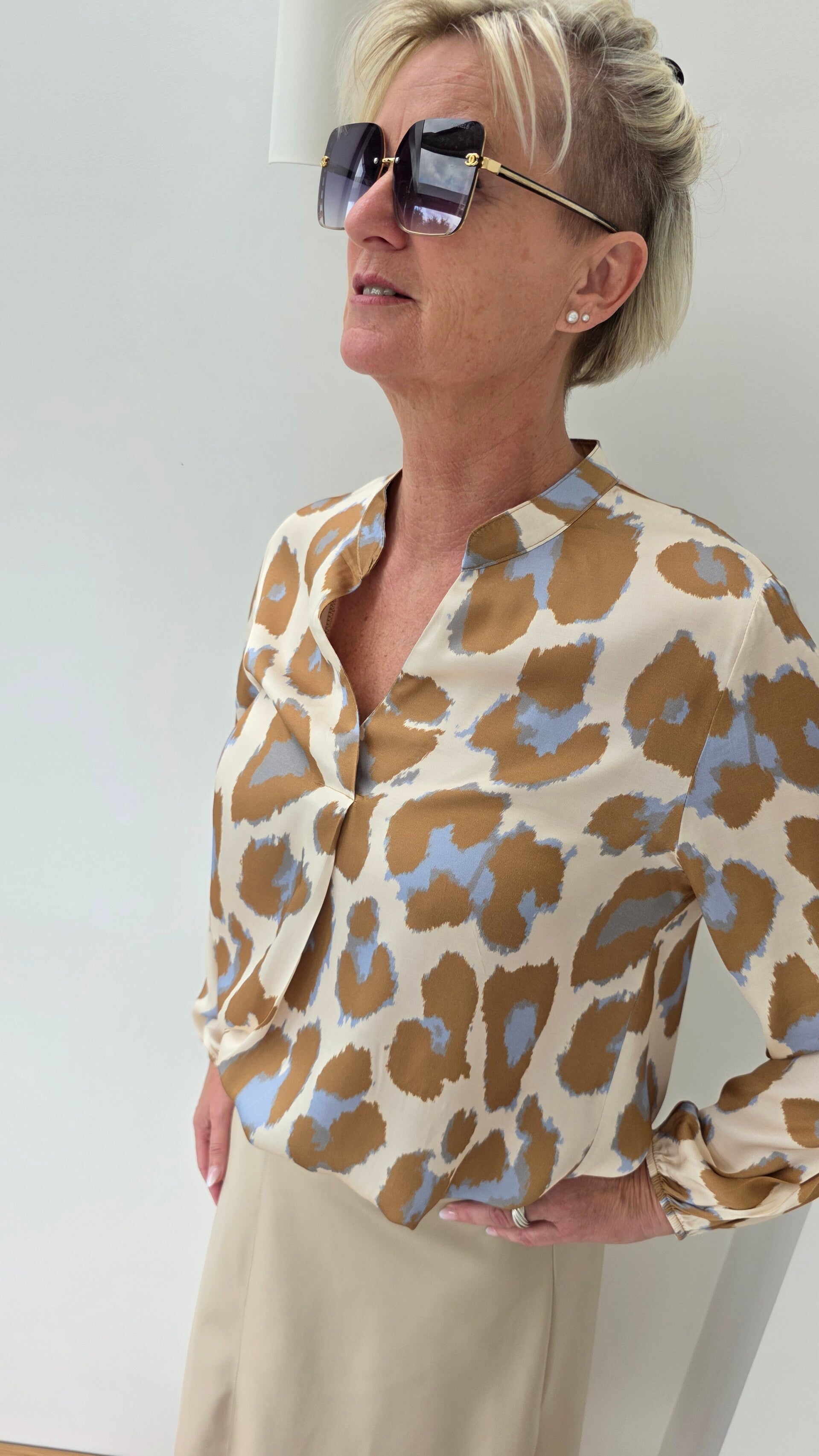 Das Modell hat einen lockeren, bequemen Schnitt mit V-Ausschnitt und kleinem Stehkragen. Besonderes Highlight ist das moderne Muster in Karamellbraun und Hellblau auf cremefarbenem Hintergrund. Die langen Ärmel sind mit einem elastischen Bund am Handgelenk versehen und verleihen der Bluse eine elegante Note.