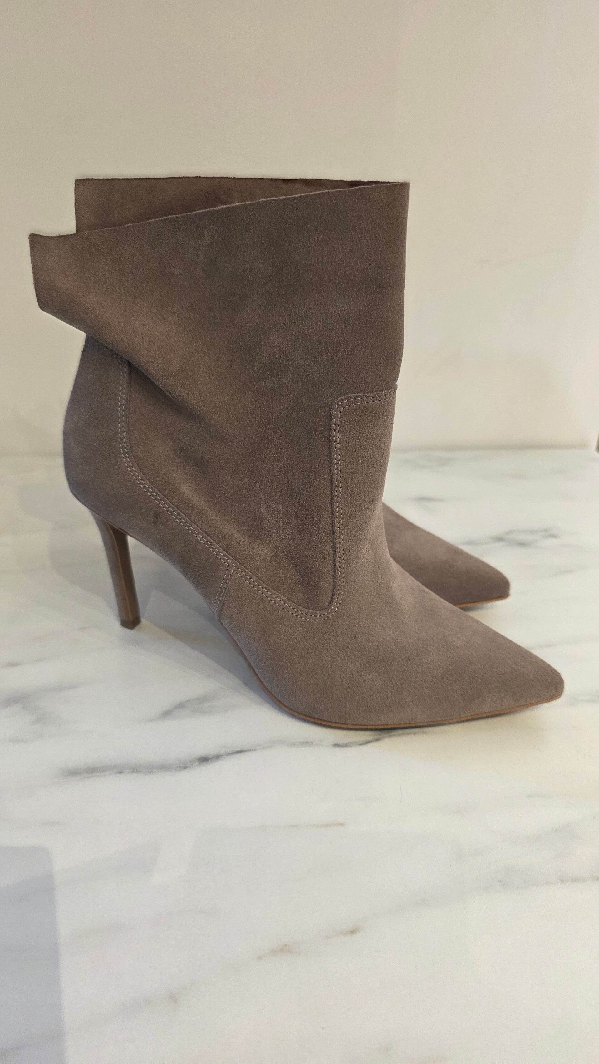 Elegante Stiefeletten aus hochwertigem echtem Wildleder. Die schlanke, spitz zulaufende Form und der hohe Stilettoabsatz (9–10 cm) strecken optisch das Bein und verleihen jeder Silhouette eine feminine Ausstrahlung.