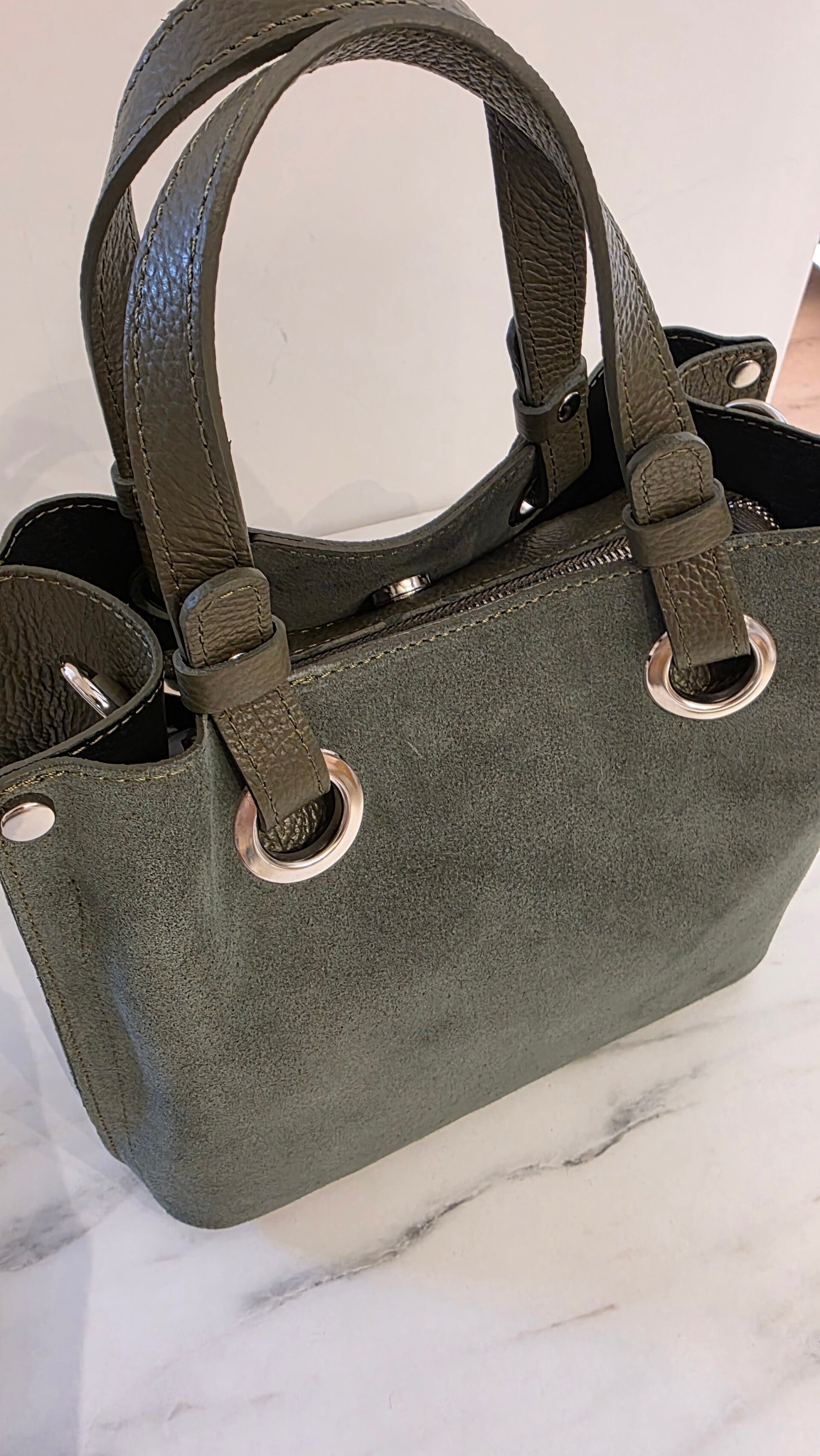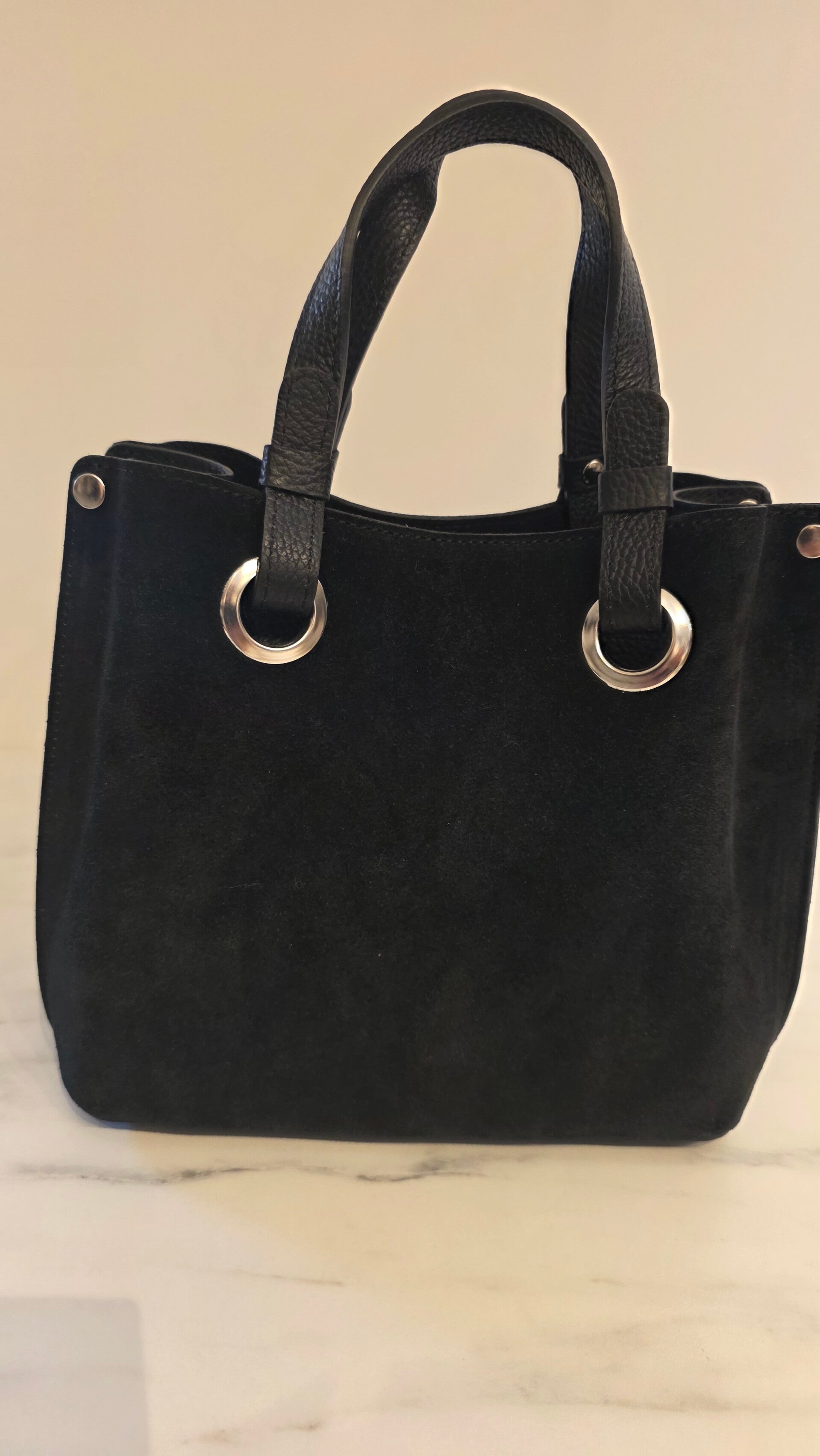 Stilvolle Handtasche aus einer Kombination von Wildleder und glattem echtem Leder. Die dekorativen Metallösen verleihen ihr einen modernen, trendigen Look, während die rechteckige Form für Alltagstauglichkeit und Eleganz sorgt.