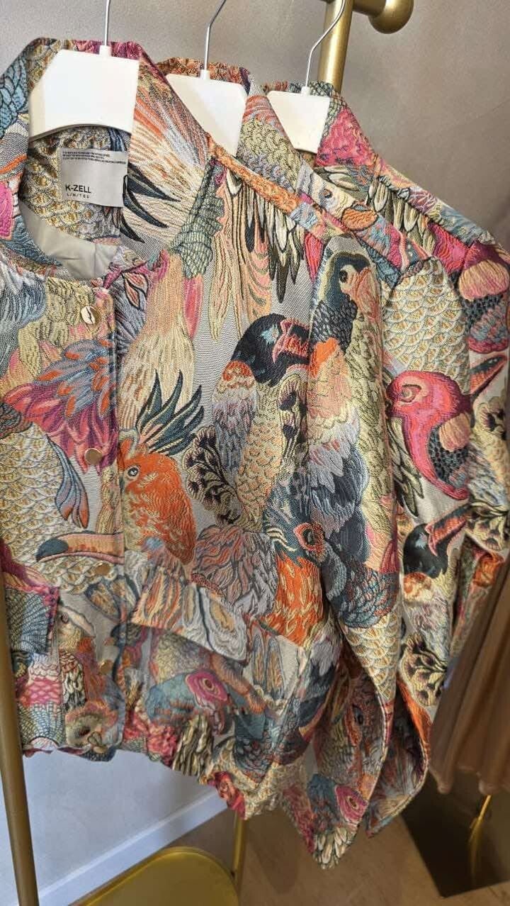 Ein echtes Statement-Piece: Diese kurze Jacke begeistert mit einem außergewöhnlichen Allover-Print im Vogel-Muster. Der leicht glänzende Stoff verleiht dem Design eine edle Note und macht die Jacke zu einem besonderen Blickfang – perfekt, um schlichte Outfits aufzuwerten.