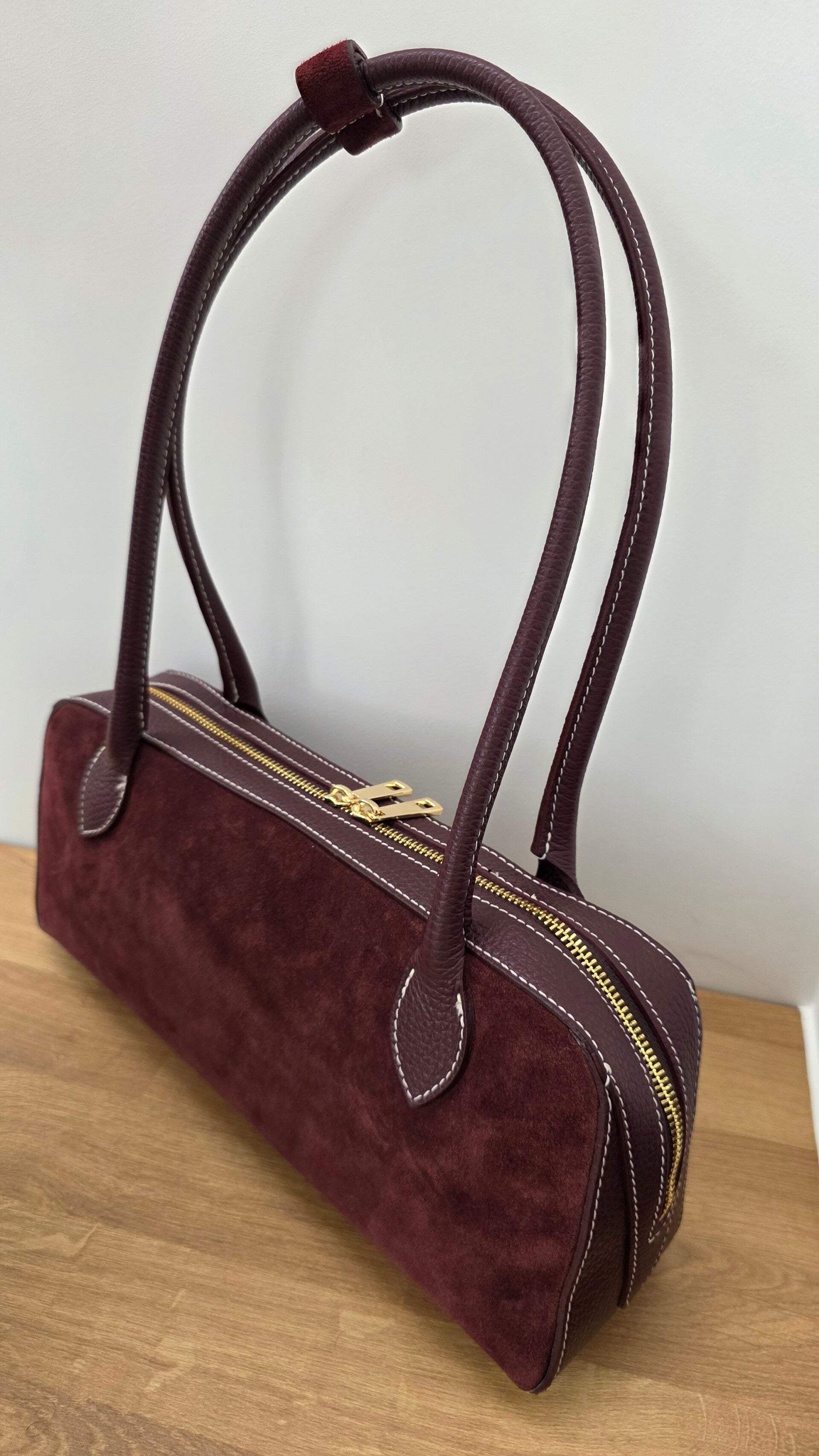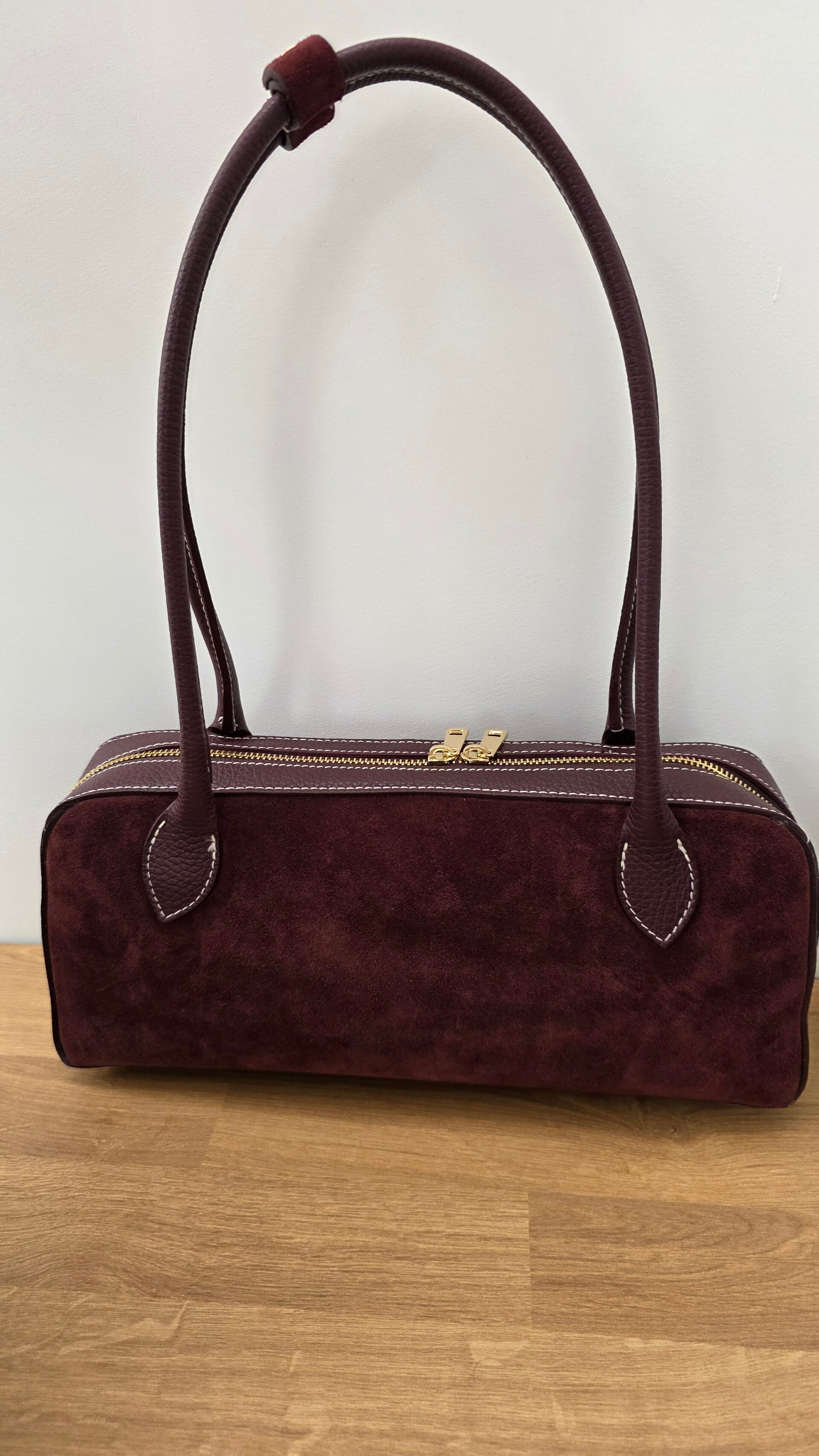 Die „Baguette“ ist eine schlanke Schultertasche aus echtem Leder – kombiniert weiches Veloursleder mit genarbten Lederdetails und markanten Kontrastnähten. Der goldfarbene Doppel-Reißverschluss sorgt für schnellen Zugriff, die stabilen Henkel liegen angenehm auf der Schulter.