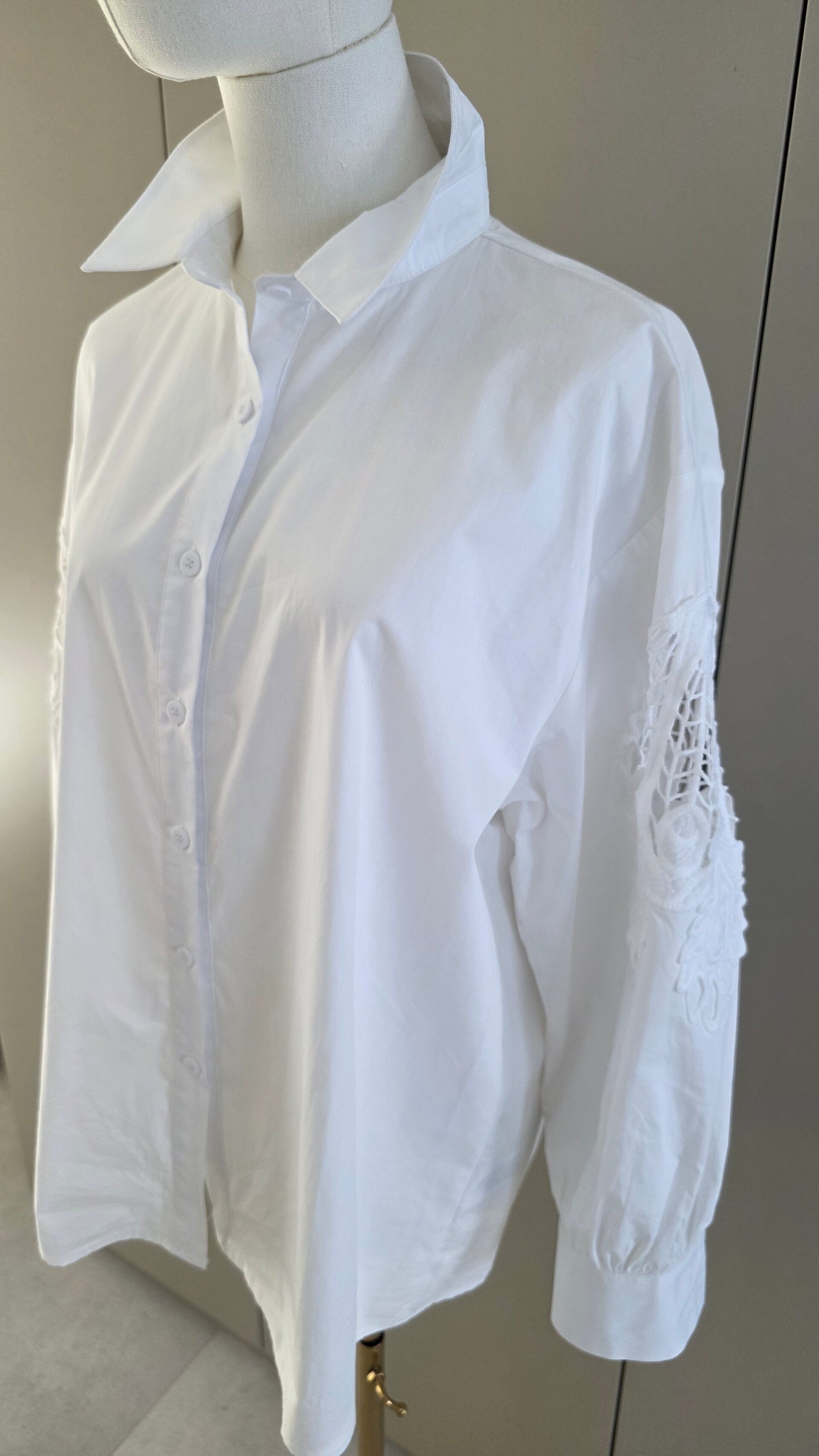 Weiße, hochwertig verarbeitete Hemdbluse aus fein gewebter, reiner Baumwolle. Locker-eleganter Schnitt mit klassischem Kragen und durchgehender Knopfleiste. Zarte Spitzen- und Cut-out-Einsätze an den Ärmeln verleihen eine edle Note.