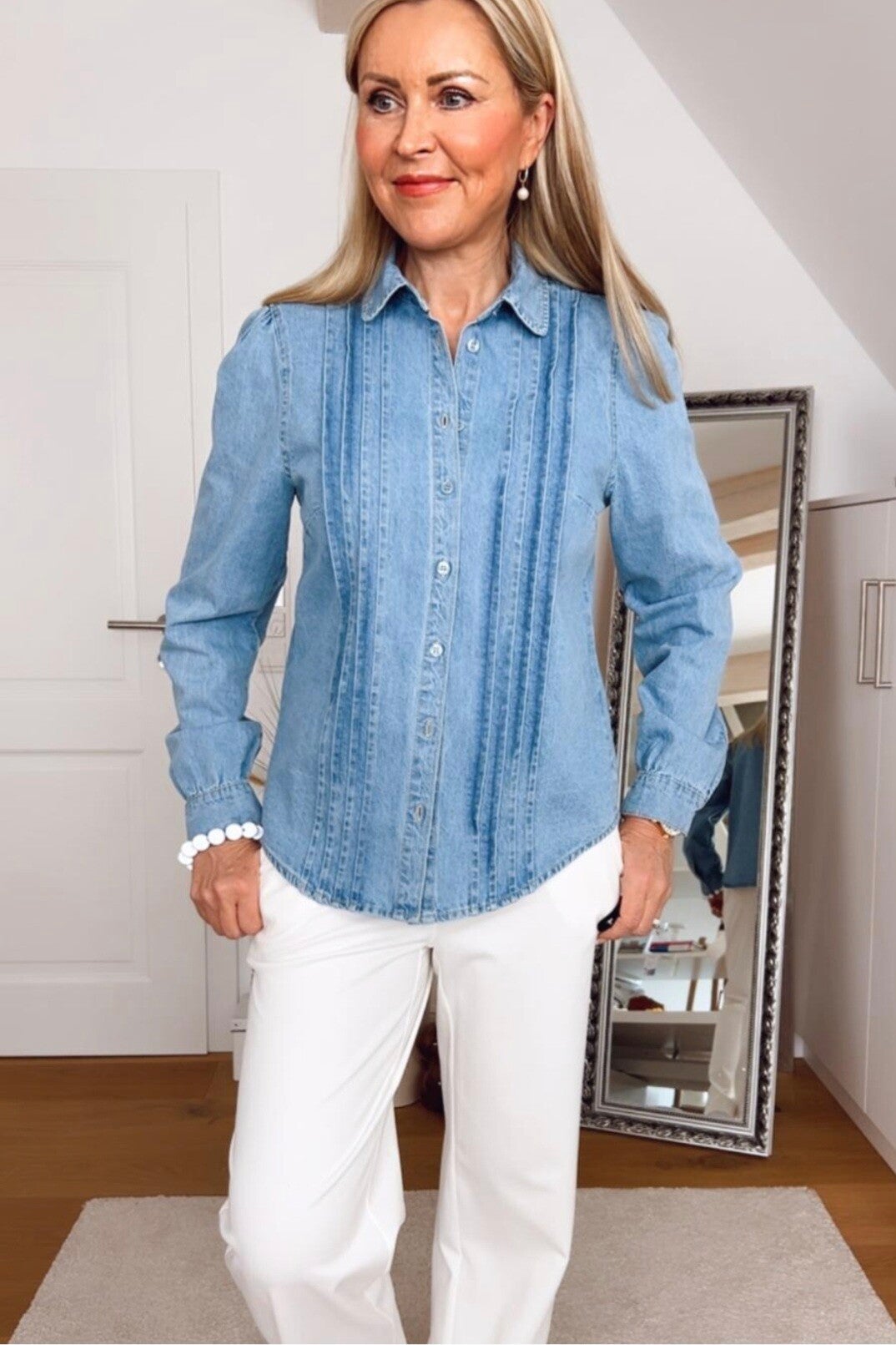 Dieses stilvolle Jeanshemd überzeugt mit seinen feinen Biesen und einem zeitlosen Design. Der klassische Schnitt wird durch feminine Details aufgewertet und macht das Hemd zu einem vielseitigen Begleiter für jeden Tag.