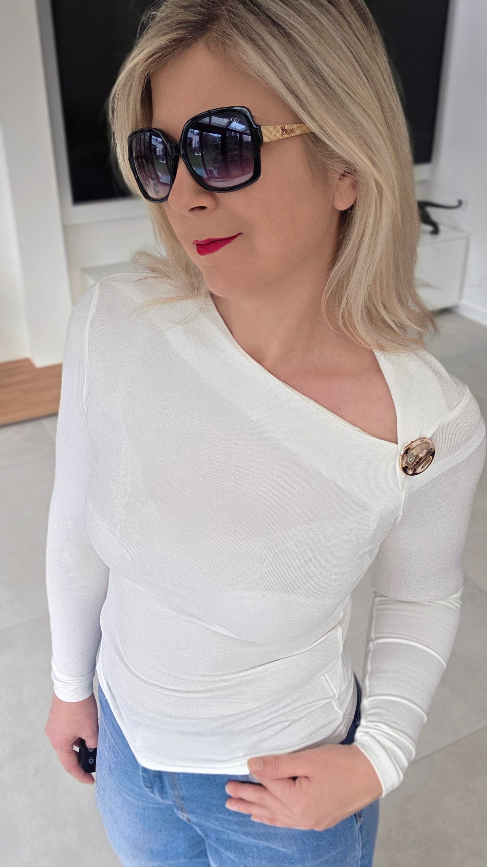 Stilvolle, figurbetonte Bluse dekorative Asymmetrischer Ausschnit und abnehmbarer Brosche. Das weiche, elastische Material sorgt für hohen Tragekomfort und eine schöne Passform. Die Brosche kann nach Belieben abgenommen werden, wodurch die Bluse sowohl elegant als auch schlicht getragen werden kann.