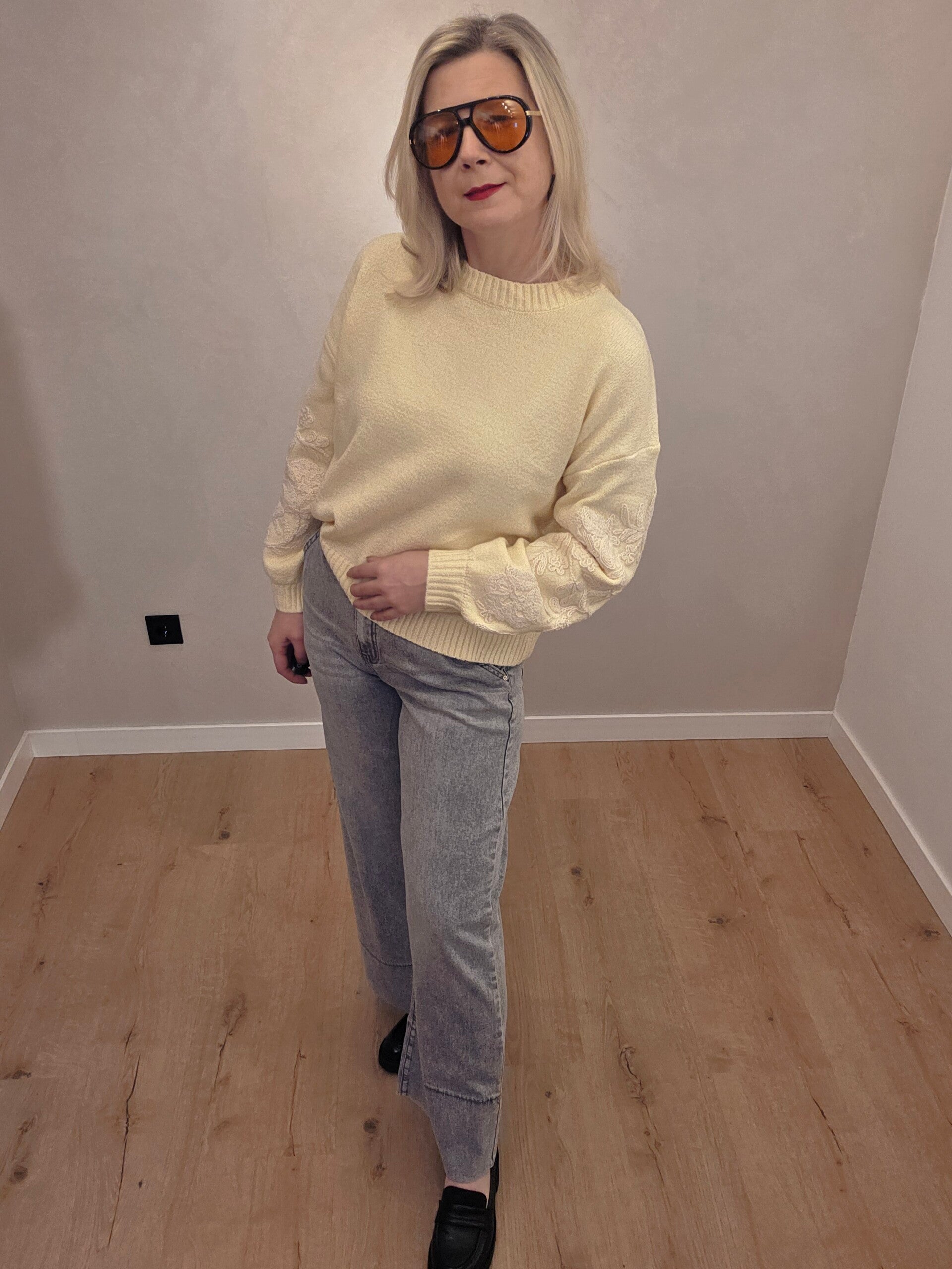 Wunderschöner, weicher Strickpullover mit dekorativer Stickerei an den Ärmeln, die dem Modell einen besonderen, femininen Charakter verleiht. Der lockere Schnitt sorgt für hohen Tragekomfort und macht den Pullover ideal für den Alltag sowie für stilvolle Casual-Looks.