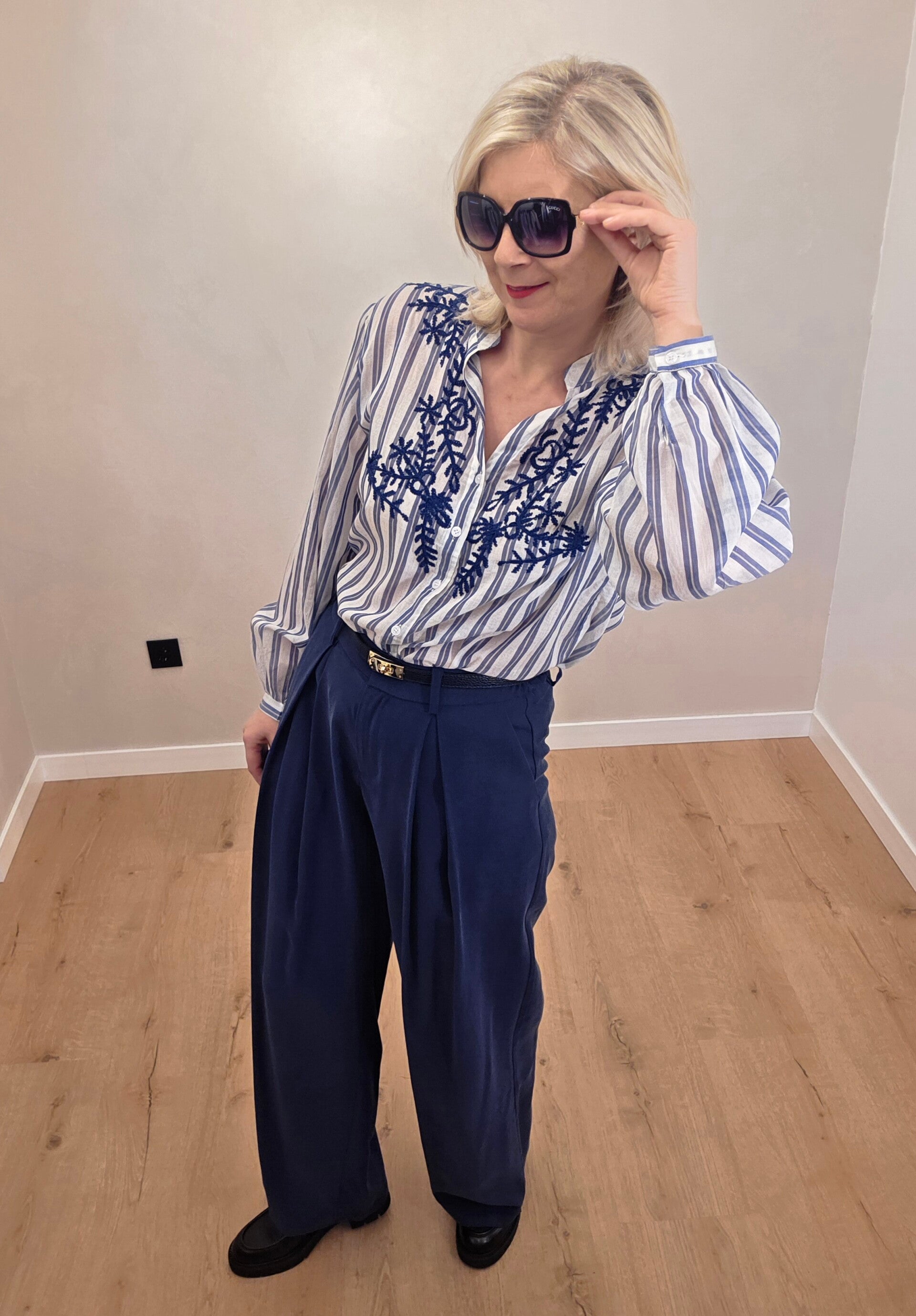 Wunderschöne, feminine Bluse mit feinen Streifen und dekorativer Stickerei im Brustbereich. Die hochwertige Verarbeitung und die edle Stickerei verleihen der Bluse einen besonderen Charakter. Perfekt kombinierbar mit Stoffhosen, Jeans oder eleganten Röcken – ideal für Alltag und Büro.