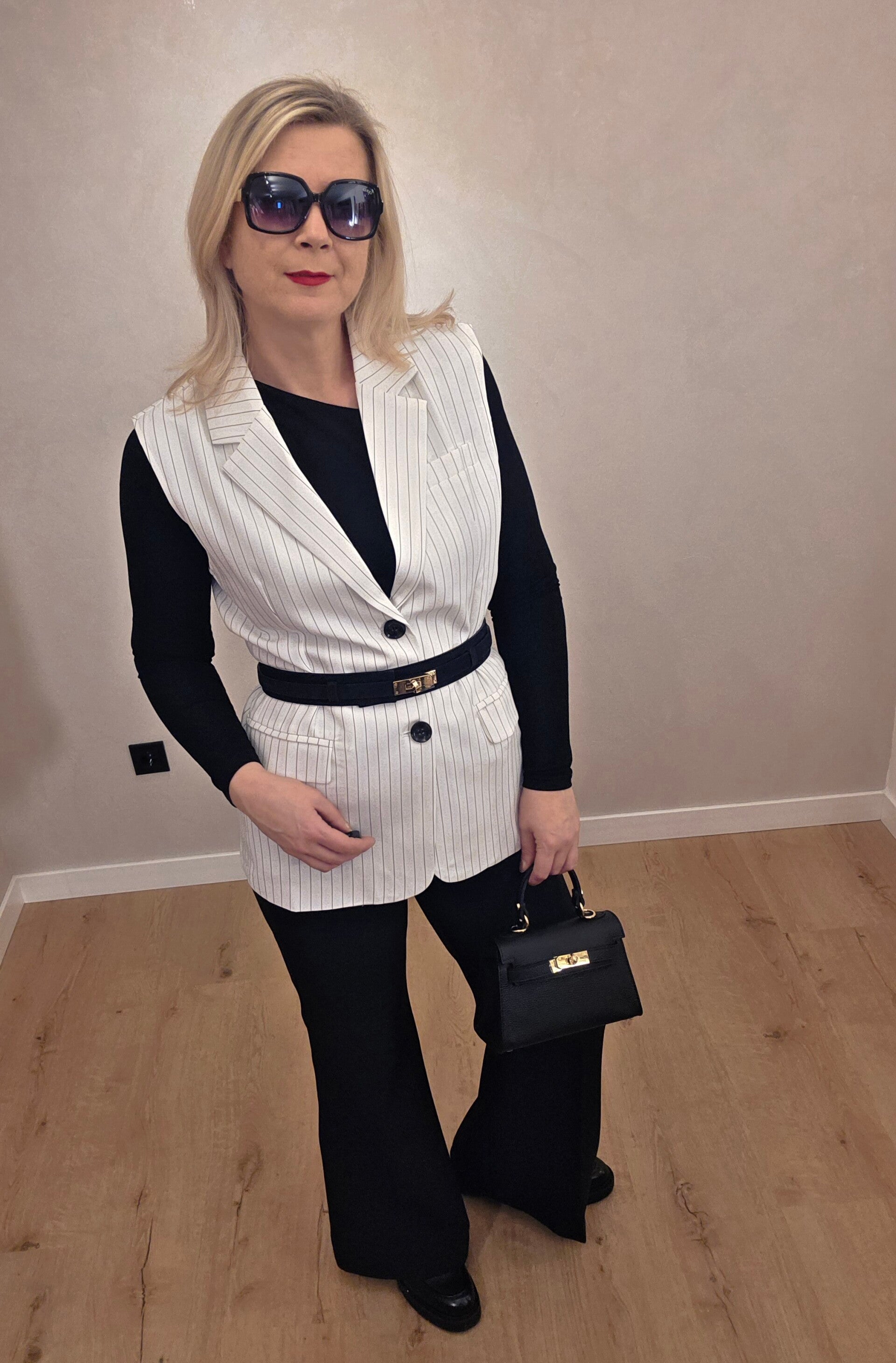 Modische, elegante Weste im angesagten Oversize-Schnitt. Das klassische Design in Weiß mit feinen schwarzen Streifen verleiht jedem Outfit einen stilvollen und modernen Look. Perfekt kombinierbar mit Blusen, Rollkragen oder schlichten Basics.