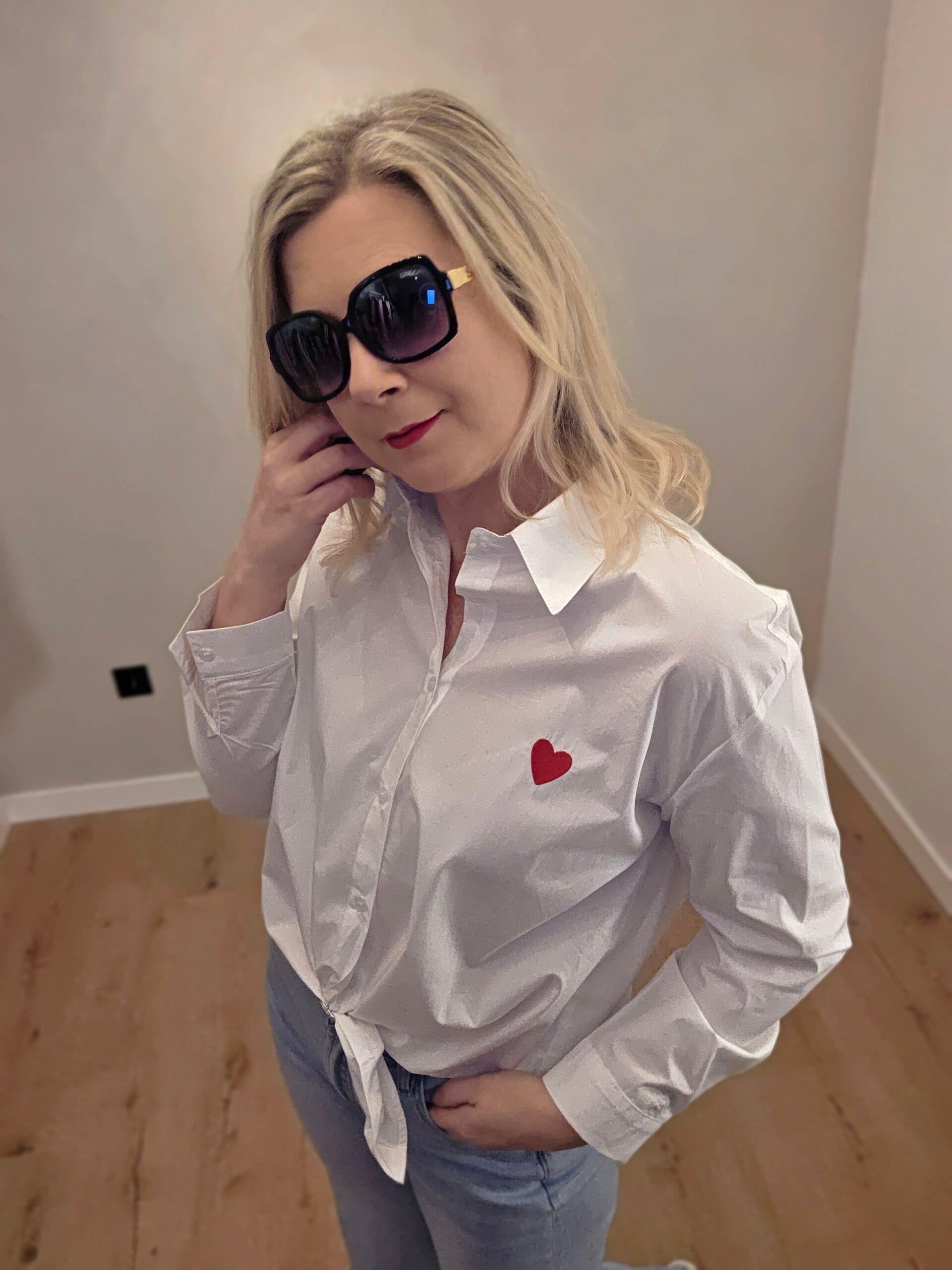 Klassische Damenbluse aus 100 % Baumwolle mit modernem Herz-Detail auf der Brust. Der zeitlose Schnitt trifft auf ein verspieltes, modisches Highlight und macht die Bluse zu einem besonderen Hingucker.
