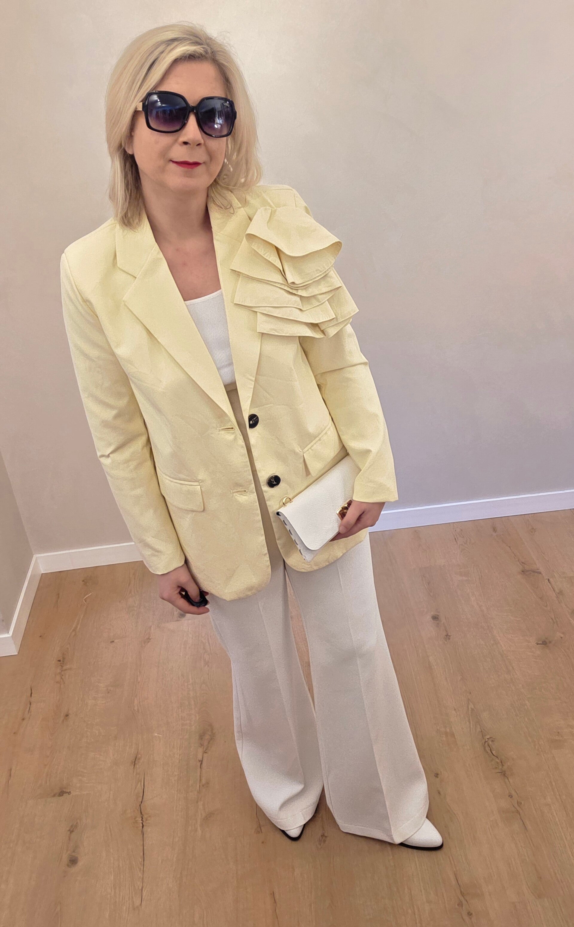 Außergewöhnlicher Damenblazer mit modischem Volant-Detail an der Schulter. Das elegante Design verleiht jedem Outfit einen besonderen Akzent und macht den Blazer zu einem echten Hingucker – ideal für elegante Anlässe, Abendlooks oder stilvolle Alltagsoutfits.