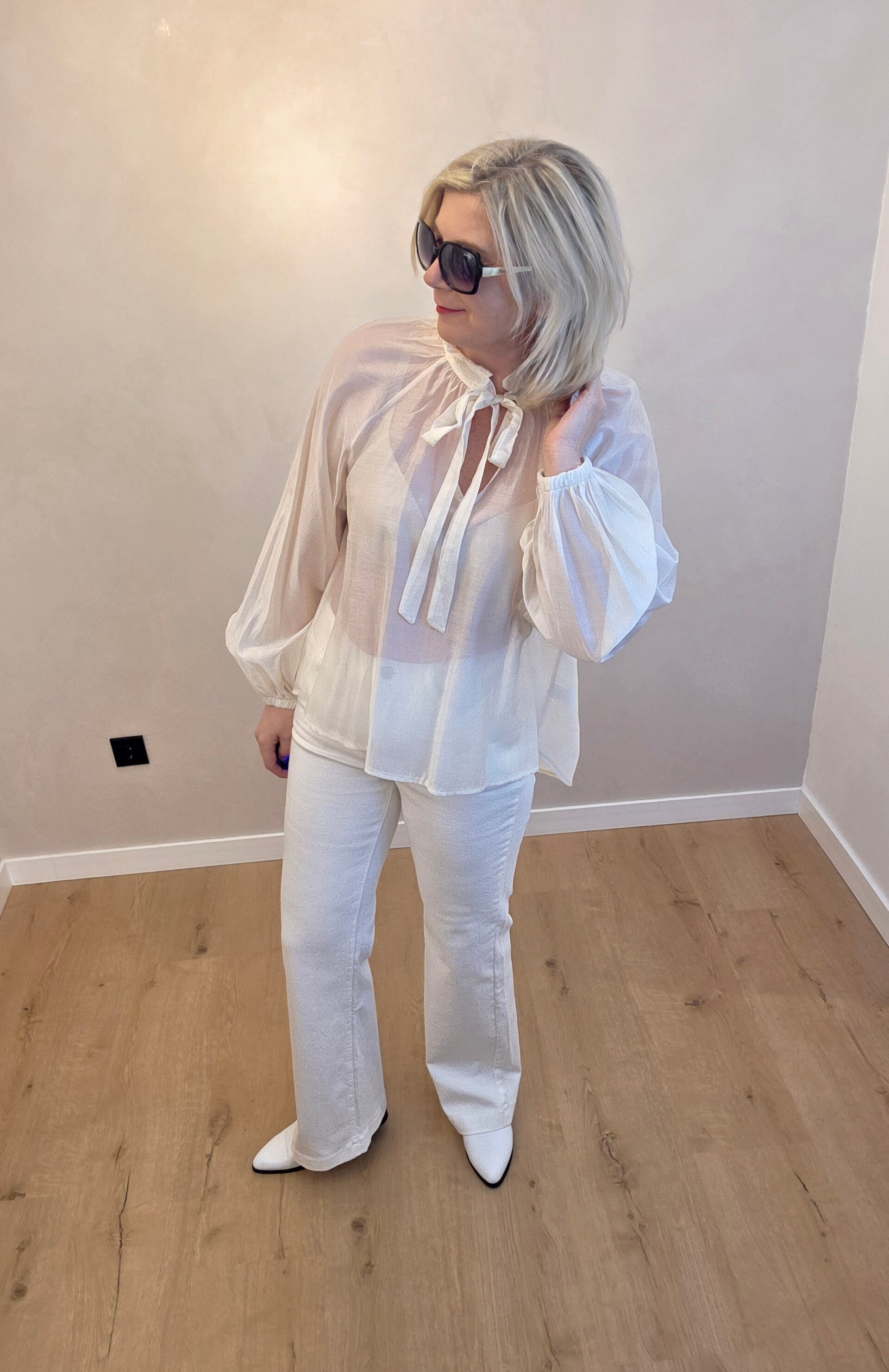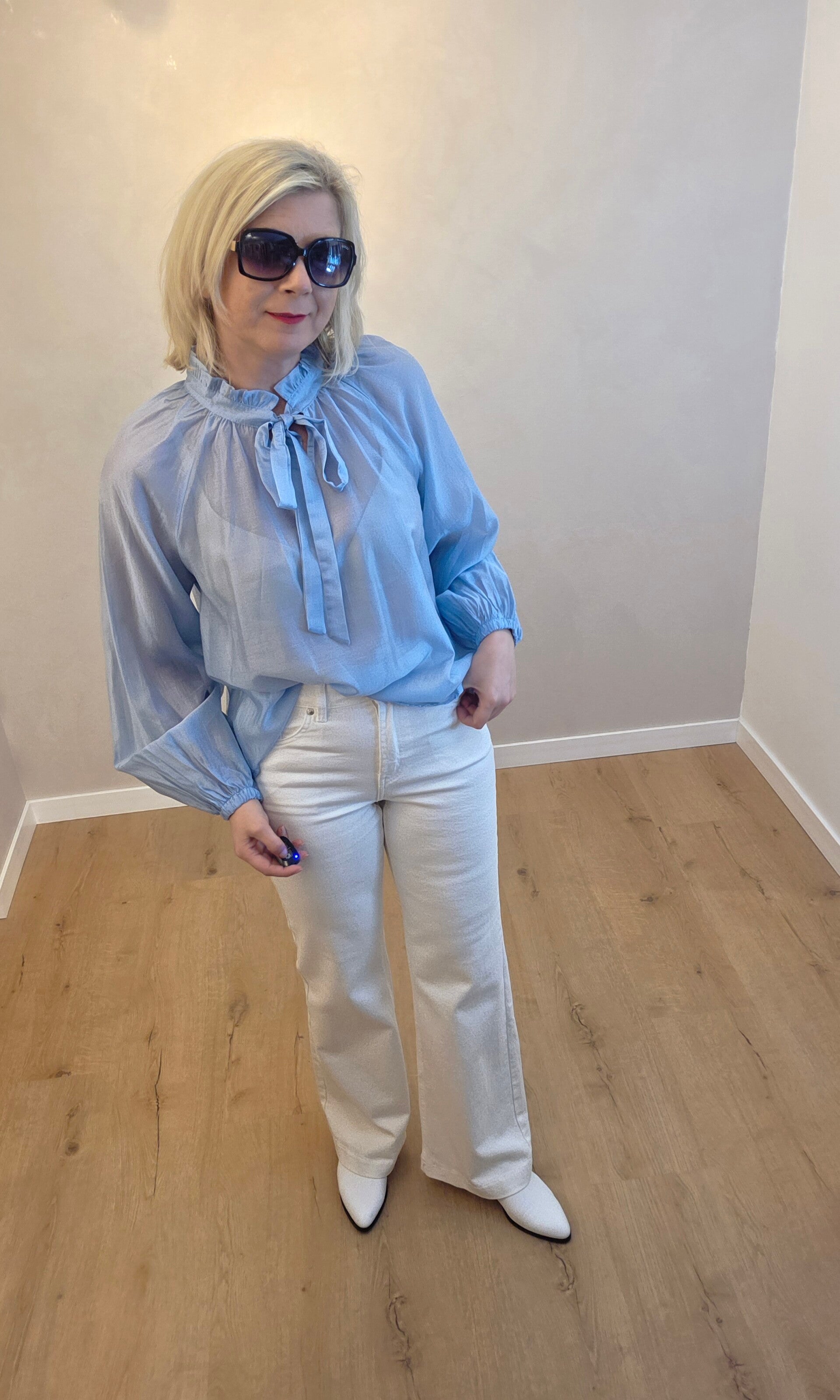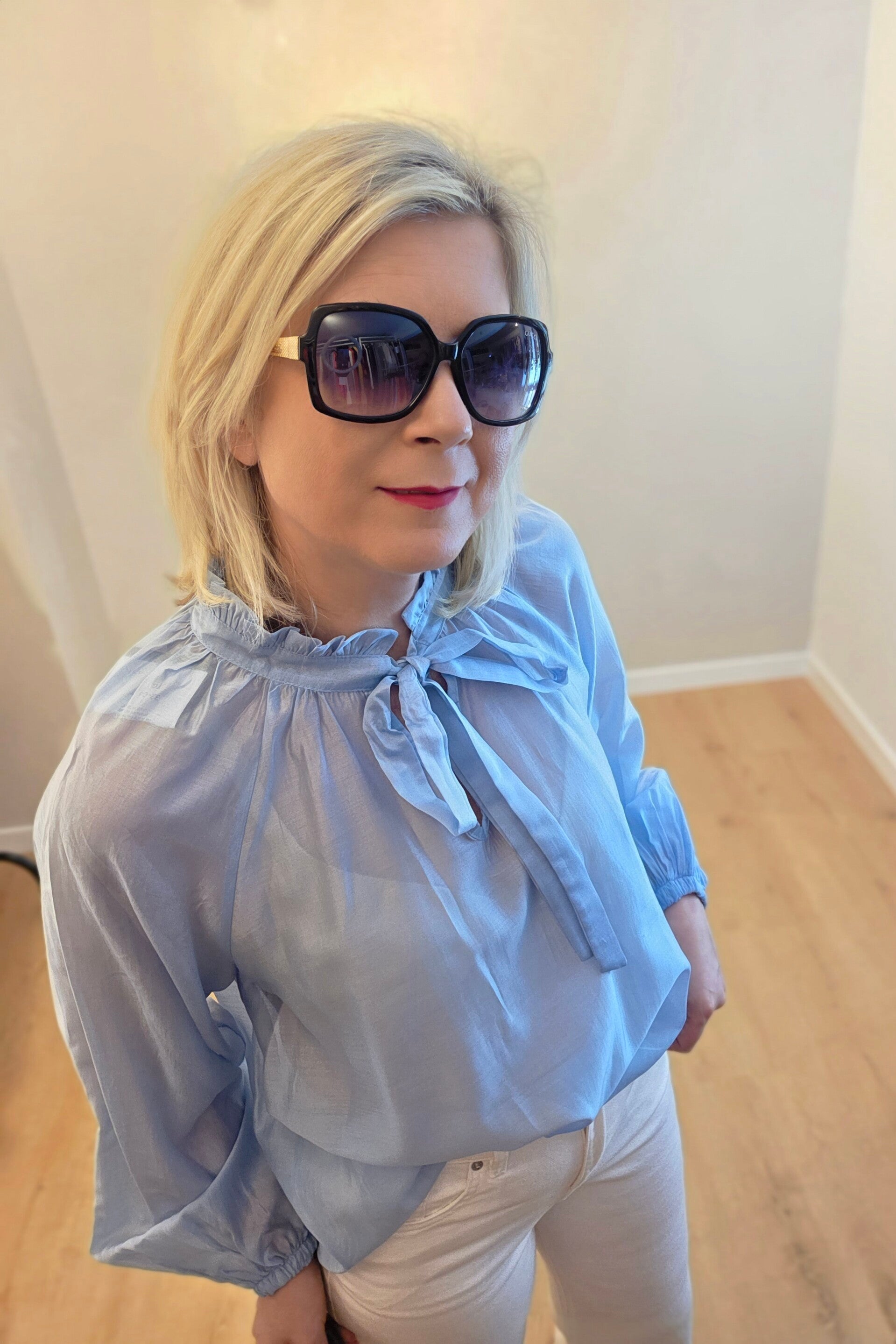 Elegante, luftige Bluse mit femininem Schleifen-Detail am Kragen. Das fließende Material sorgt für einen besonders angenehmen Tragekomfort und eine schöne, lockere Passform. Perfekt für stilvolle Alltagslooks oder elegante Kombinationen.