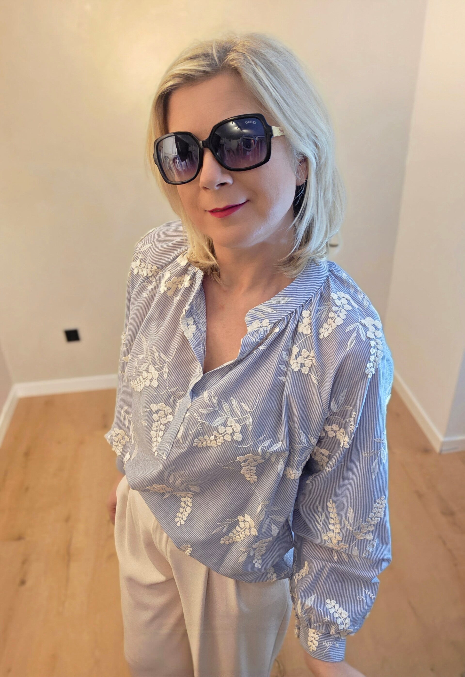 Elegante Damenbluse aus 100% Baumwolle mit feinem Streifenmuster und dekorativer Blumenstickerei. Der leichte, angenehme Stoff sorgt für hohen Tragekomfort und einen stilvollen, femininen Look. Perfekt für Alltag, Büro oder elegante Kombinationen.