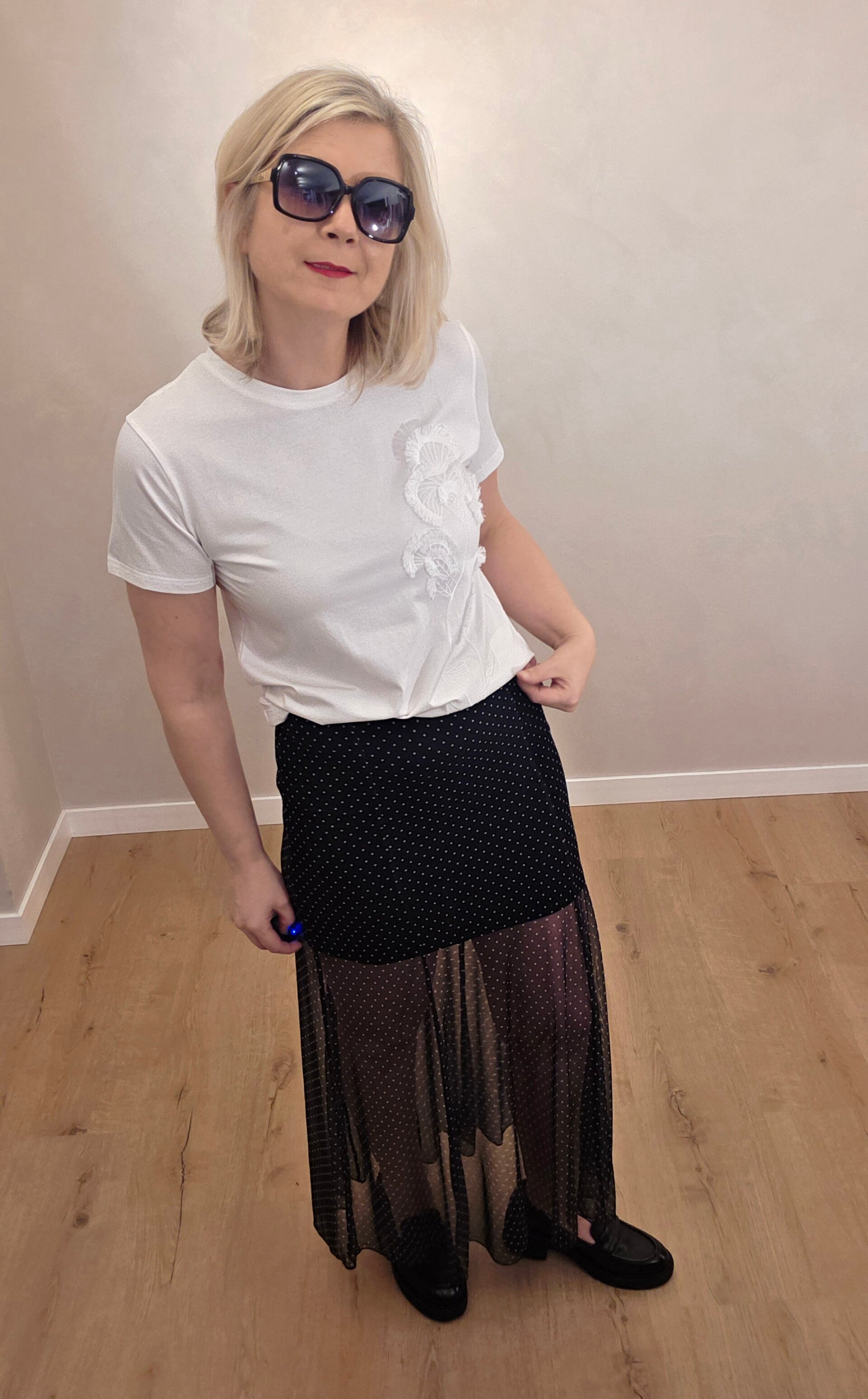 Stilvoller Damenrock aus leichtem, fließendem Stoff mit zartem Punktmuster. Der transparente Saum verleiht dem Rock eine elegante und feminine Note. Perfekt für besondere Anlässe, Abendlooks oder auch stilvolle Alltagsoutfits.