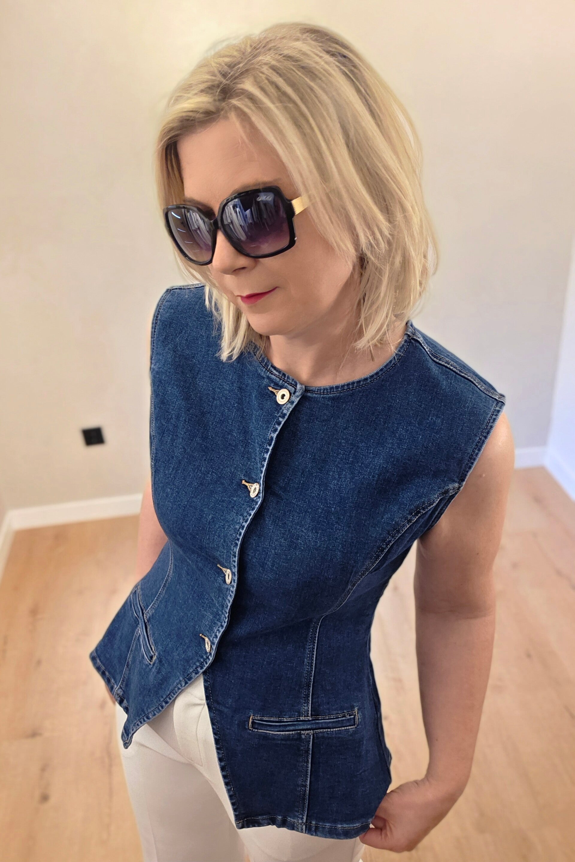 Stylische Damenweste aus Denim mit figurbetontem Schnitt. Die Weste betont die Taille und verleiht jedem Outfit einen modernen, femininen Look. Perfekt kombinierbar mit Blusen, Shirts oder Kleidern.
