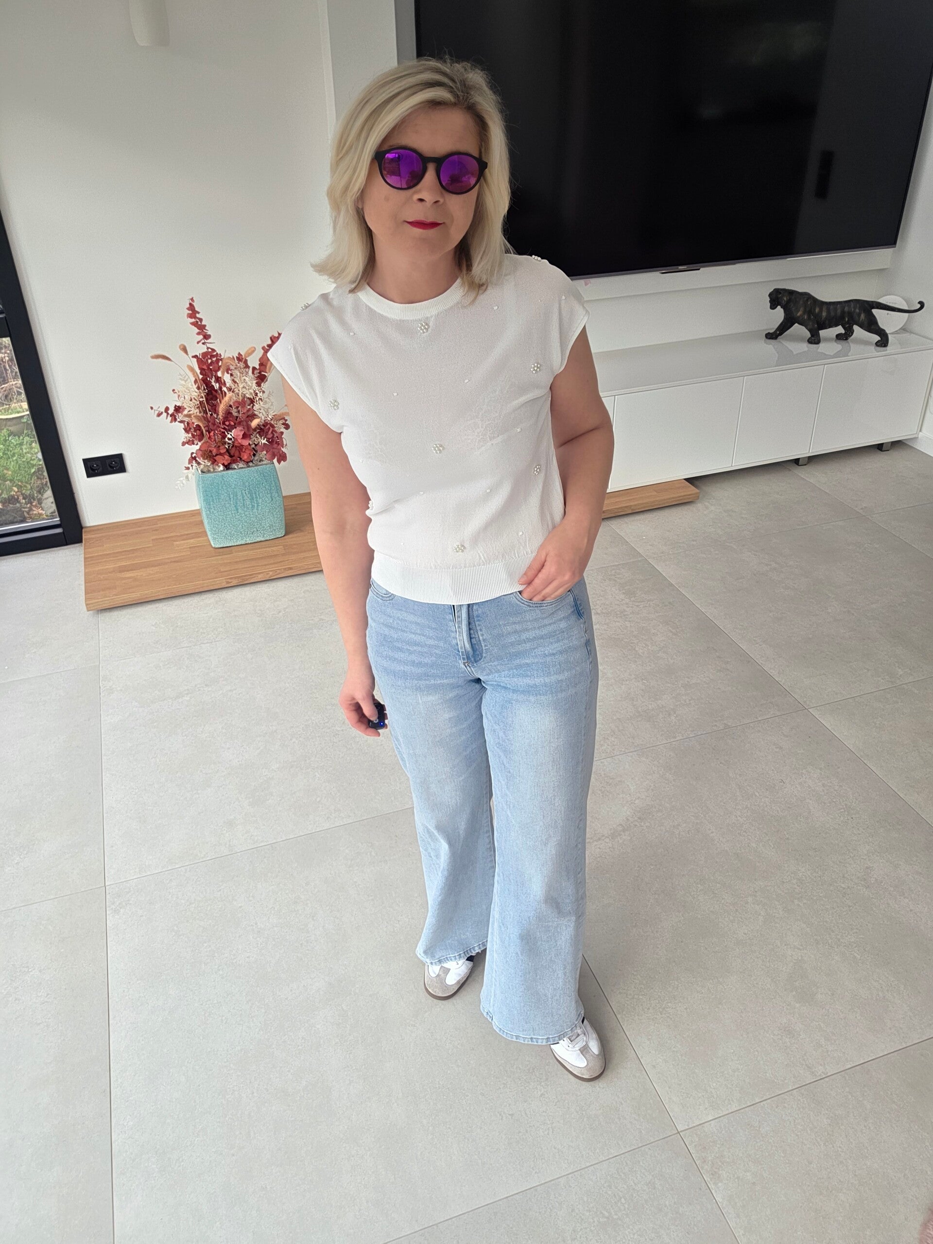 Zartes Feinstrick-Top mit kleinen Perlen-Details – ein echter Hingucker für einen eleganten und gleichzeitig lässigen Look.