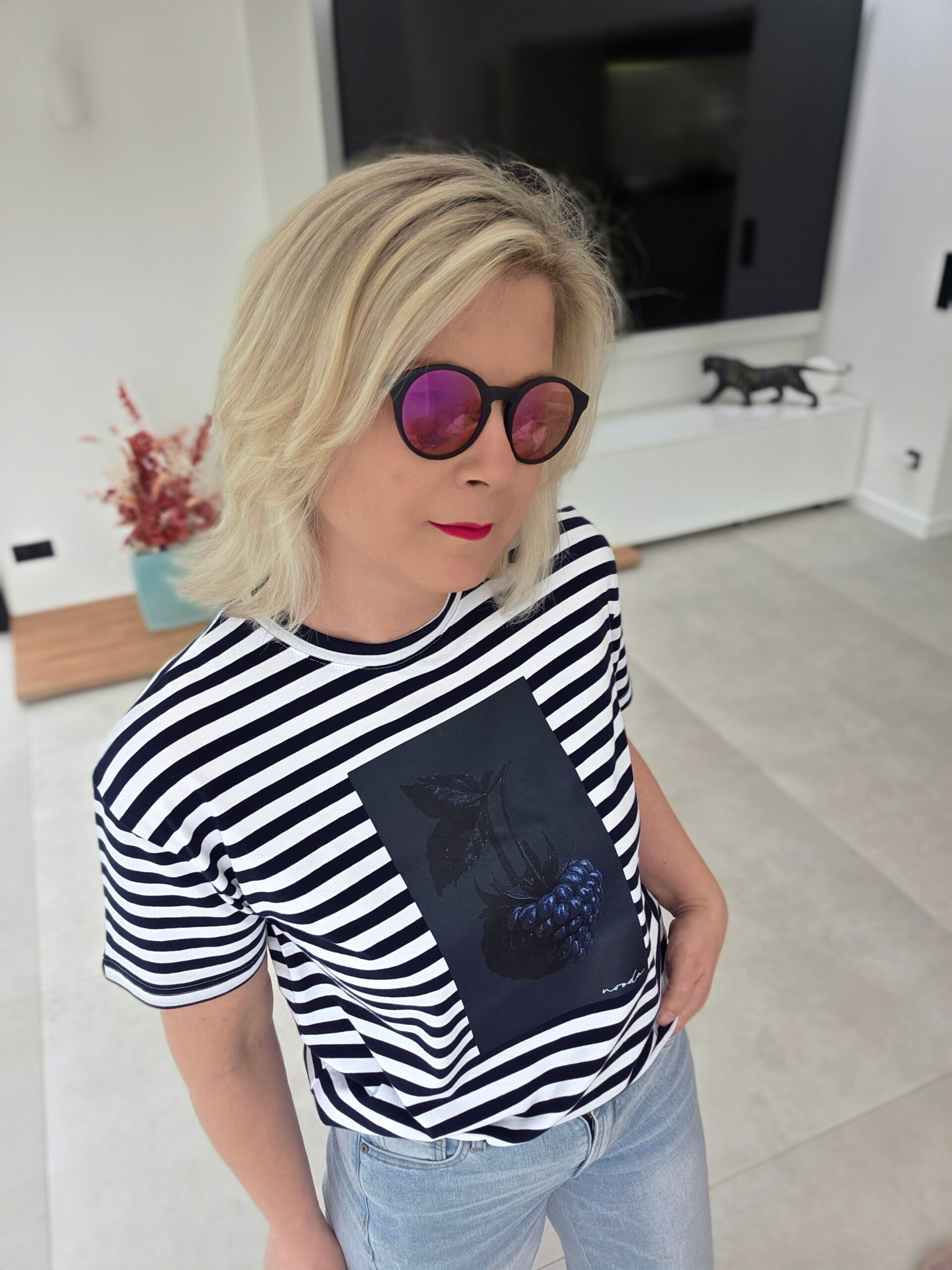 Streifen T-Shirt mit „Himbeere“-Print – modern & verspielt